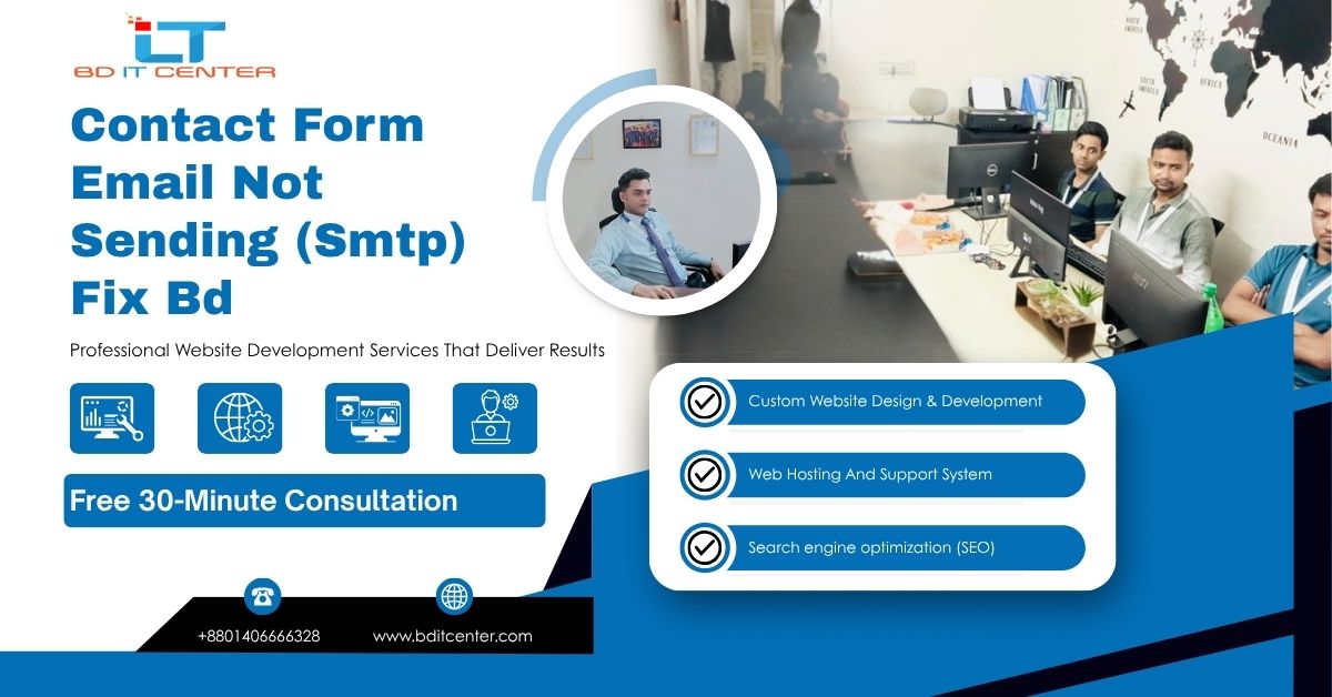 আজকাল প্রায় সব ওয়েবসাইটেই Contact Form ব্যবহার করা হয় — কিন্তু যদি আপনার Contact Form থেকে ইমেইল না যায়, তাহলে সেটা শুধু visitor loss নয়, business lossও! এই সমস্যাটি সাধারণত SMTP configuration error, hosting email block, বা security plugin conflict থেকে হয়। আজকের এই গাইডে আমরা বিস্তারিত জানব কিভাবে “Contact Form Email Not Sending (SMTP) Fix BD” সমস্যাটি একদম সহজে সমাধান করা যায় — এবং কেন আপনি BD IT CENTER-এর মতো অভিজ্ঞ ওয়েব ডেভেলপমেন্ট কোম্পানির সাহায্য নেবেন।
