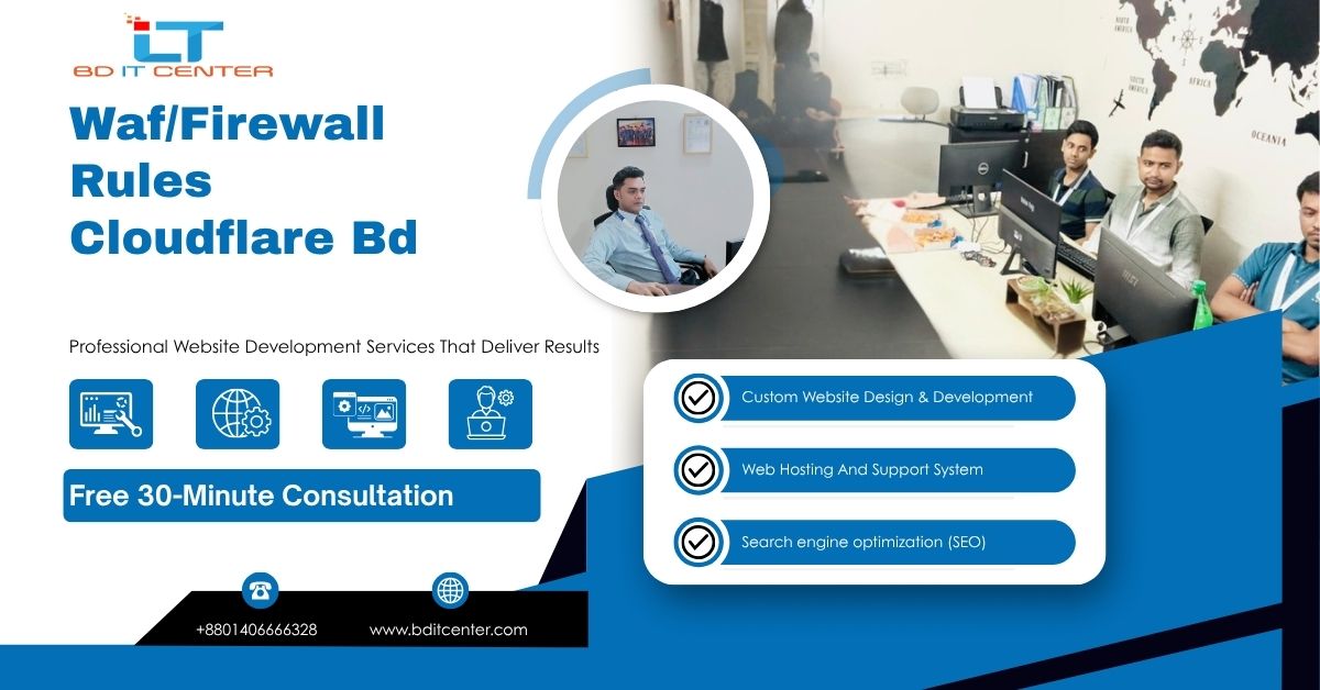BD IT CENTER, বাংলাদেশের টপ-রেটেড ওয়েব ডেভেলপমেন্ট কোম্পানি, Cloudflare WAF & Firewall Rules সেটআপে দিচ্ছে সবচেয়ে নির্ভরযোগ্য সার্ভিস — সাশ্রয়ী মূল্যে, রিয়েল-টাইম সাপোর্টসহ।