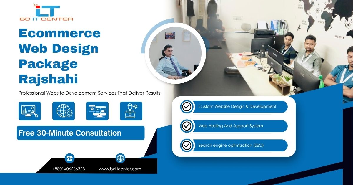 Ecommerce Web Design Package Rajshahi with secure payment, fast hosting, SEO, training & full support. BD IT CENTER builds high-converting online shops in Bangladesh.