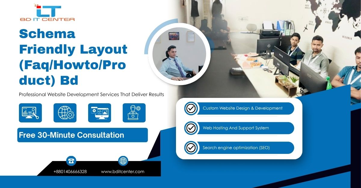 Learn how Schema-friendly layouts (FAQ, HowTo, Product) boost SEO in Bangladesh. BD IT CENTER shares best practices, examples, pricing & real-time support.